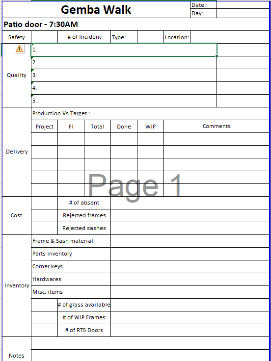 In conclusion, the Gemba Walk was a valuable tool for me to understand the current processes and identify areas for improvement in the window wall manufacturing department. By working with the production team, we were able to improve the overall efficiency and increase production output, which resulted in a significant improvement in the company’s bottom line.Top of Form