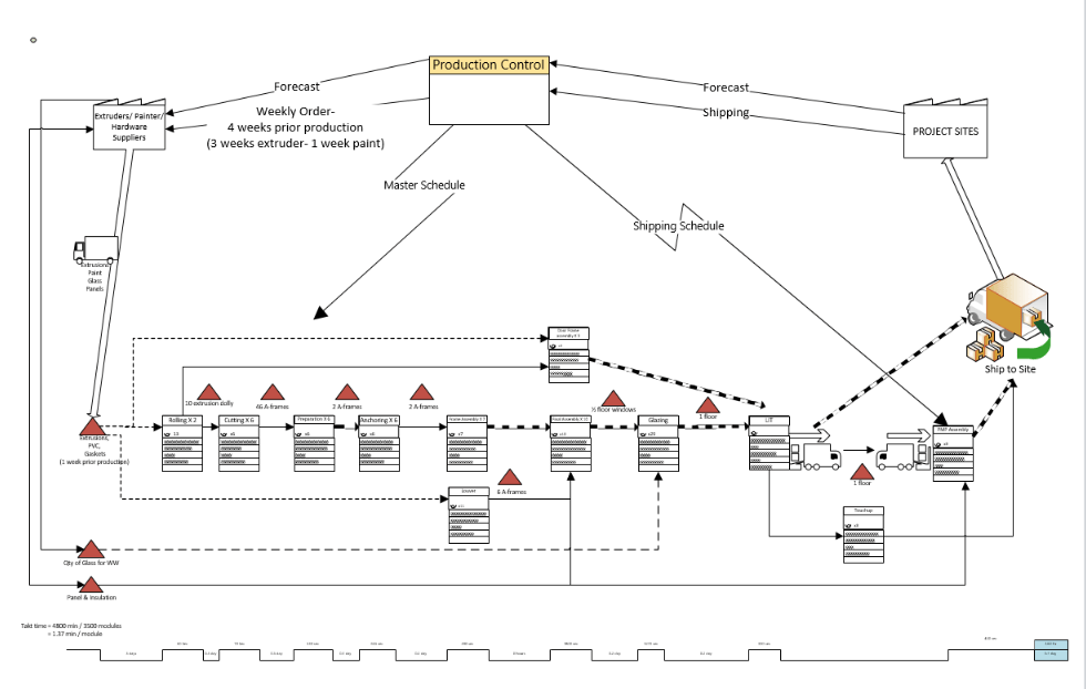 As part of the VSM, I carried out a time study to gather accurate data on the process times, queue times, and wait times within the Patio Door manufacturing process. The time study was conducted using a stopwatch and recorded every step of the process, including the time it took for each activity, as well as any wait times. The data gathered from the time study was used to create a detailed representation of the current process, including process times, queue times, and wait times.